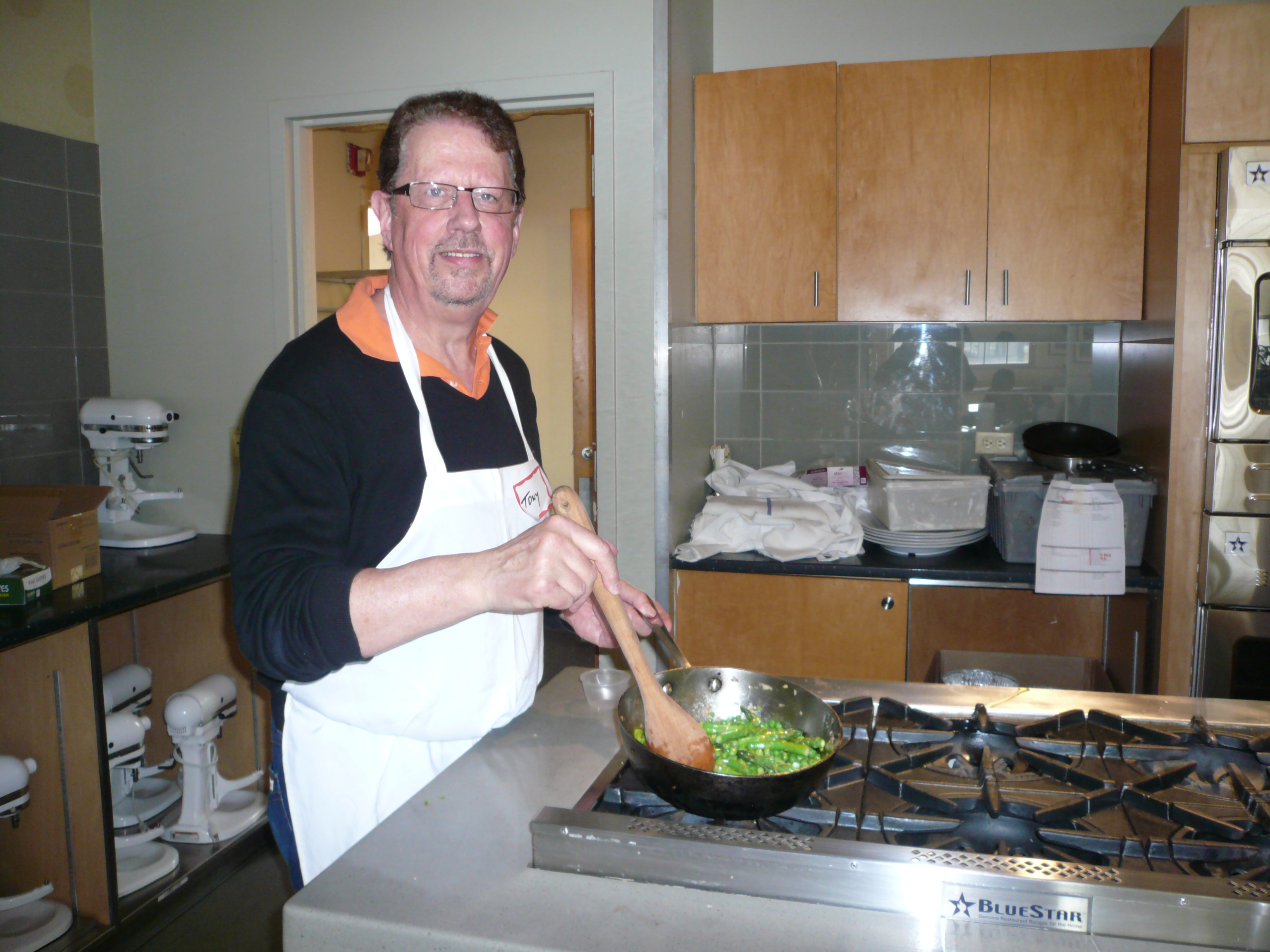 Cooking asparagus (which he hates) and peas. Now a convert